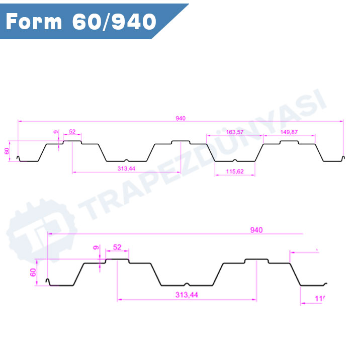 Trapez sac hesaplama da esas olan Rulo sac genişliği ve kalınlığıdır. 60/940 formu 1200 mm ile 1250 mm arasındaki ölçülerden den çekilmektedir.